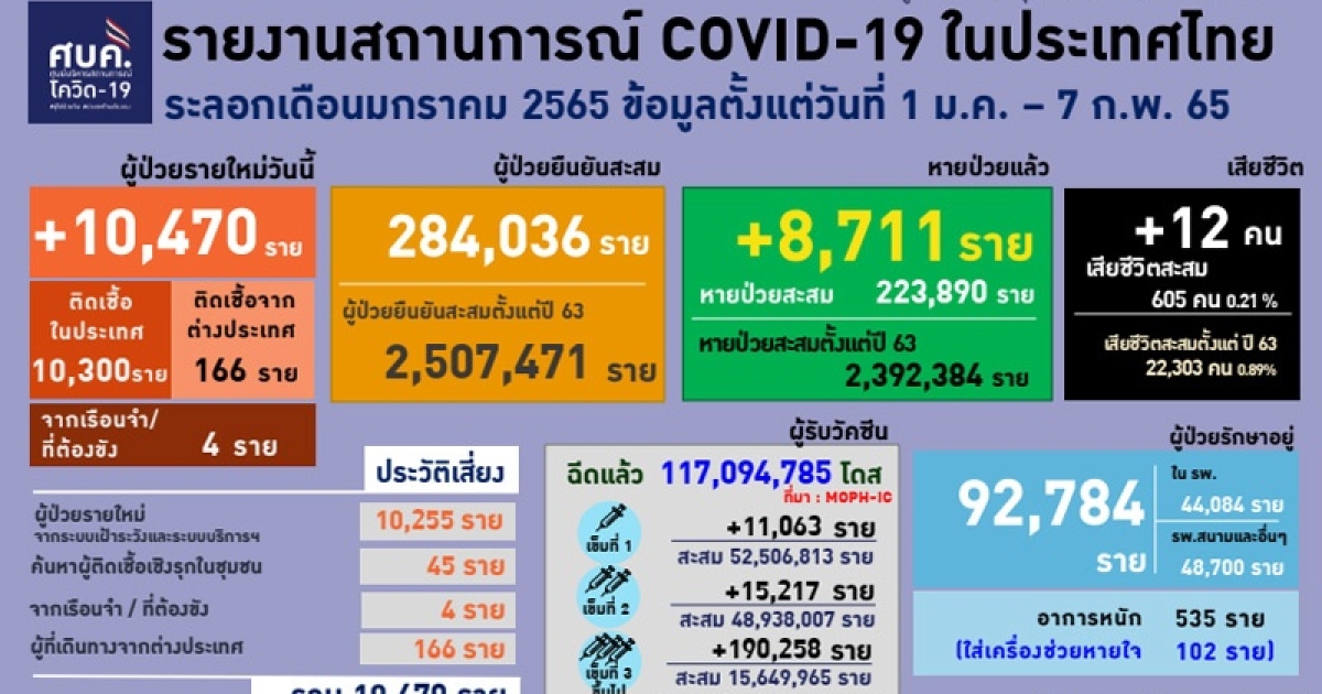 สำนักข่าวอิศรา (www.isranews.org) รายงานว่า เมื่อวันที่ 7 ก.พ. 2565 พญ.สุมนี วัชรสินธุ์ ผู้อำนวยการสำนักสื่อสารความเสี่ยงและพัฒนาพฤติกรรมสุขภาพ ในฐานะผู้ช่วยรองโฆษกศูนย์บริหารสถาการณ์โควิด-19 (ศบค.) รายงานสถานการณ์ประจำวัน โดยพบผู้ป่วยรายใหม่ 10,470 ราย จำแนกเป็น ติดเชื้อในประเทศ 10,304 ราย เกิดจากระบบเฝ้าระวังและระบบบริการฯ 10,255 ราย เกิดจากการค้นหาเชิงรุกและพบการติดเชื้อในชุมชน 45 ราย ติดเชื้อภายในเรือนจำ 4 ราย อีก 166 รายเดินทางกลับมาจากต่างประเทศ รวมผู้ป่วยสะสม 2,507,471 ราย