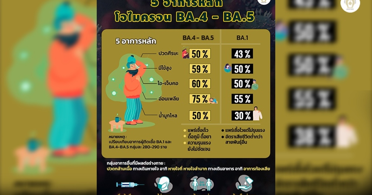 ดร.อนันต์ จงแก้ววัฒนา นักไวรัสวิทยา ไบออนเทค โพสต์ข้อความผ่านเฟซบุ๊ก ระบุหน่วยงานสาธารณสุขของฝรั่งเศส เผยอาการที่พบมากกว่า 50% ของผู้ป่วยโอไมครอน BA.4-BA.5 คือ อ่อนเพลีย ไอ ไข้ ปวดศีรษะ น้ำมูกไหล จากการเก็บข้อมูลอาการผู้ติดเชื้อสายพันธุ์ BA.1 และ BA.4/BA.5 จากผู้ป่วยกลุ่มละ 280-290 คน