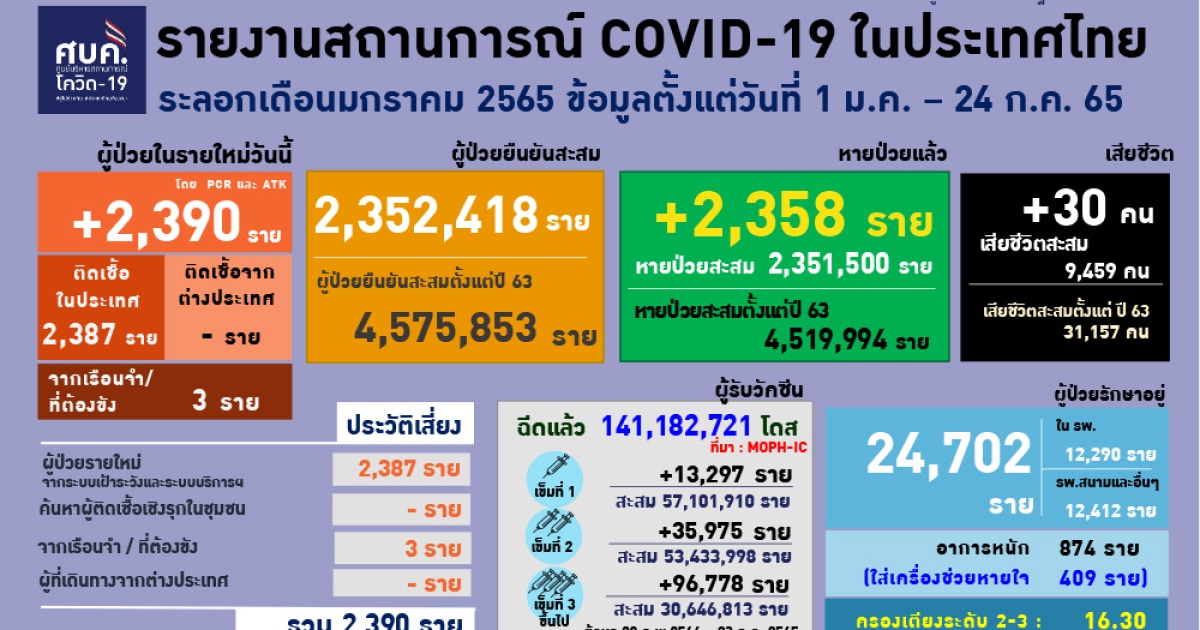 ตาย 30 คน! โควิดไทยวันนี้ ติดเชื้อเข้า รพ.เพิ่ม 2,390 หายป่วย 2,358 -รักษาตัว 24,702