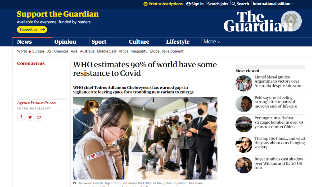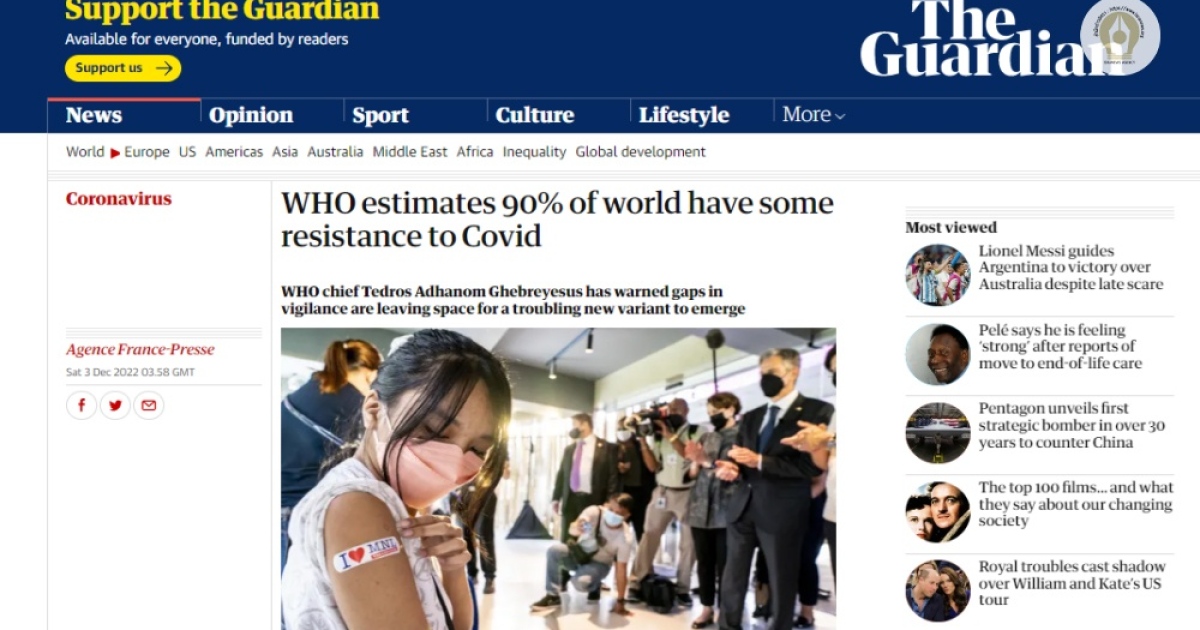 เรียบเรียงจาก:https://www.theguardian.com/world/2022/dec/03/who-estimates-90-of-world-have-some-resistance-to-covid