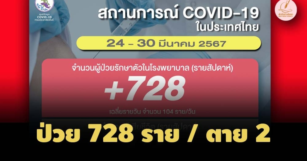 สำนักข่าวอิศรา (www.isranews.org) รายงานความคืบหน้าสถานการณ์การแพร่ระบา่ดเชื้อโควิด 19 รายสัปดาห์ ระหว่างวันที่ 24 - 30 มีนาคม 2567 ว่า ผู้ป่วยรักษาตัวในโรงพยาบาล (รายสัปดาห์) จำนวน 728 ราย เฉลี่ยรายวัน จำนวน 104 ราย/วัน