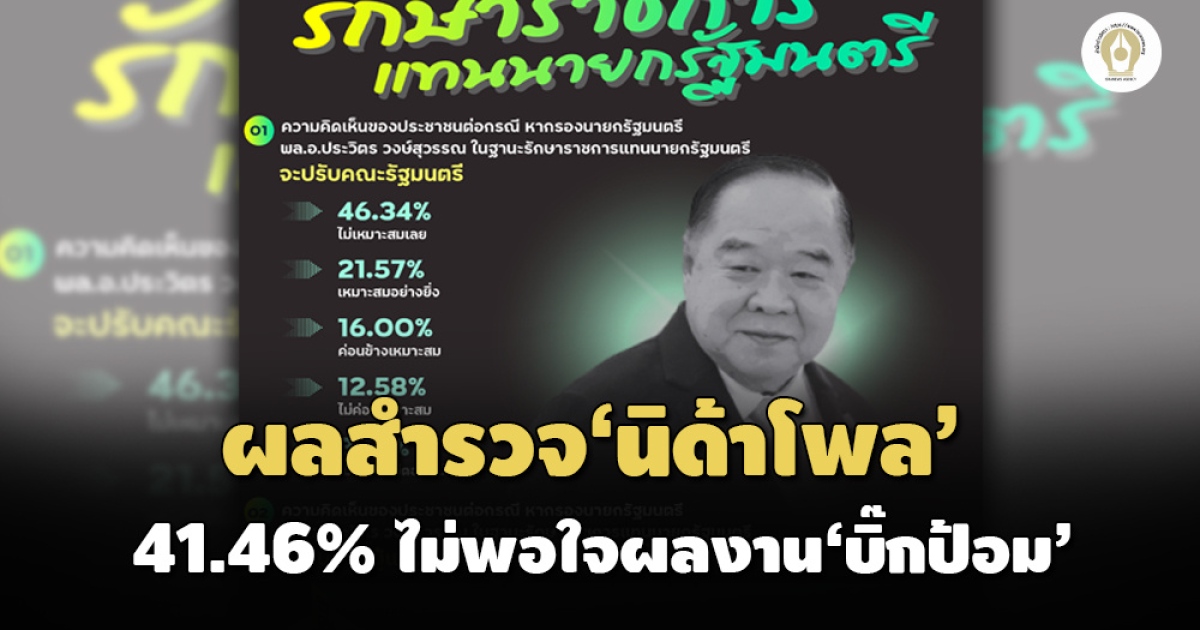 ‘นิด้าโพล’ เผยผลสำรวจประชาชน 41.46% ไม่พอใจผลงาน ‘บิ๊กป้อม’ ในฐานะรักษาการนายกฯ ขณะที่ 63.80% สนับสนุนให้มีการยุบสภาเพื่อจัดเลือกตั้งใหม่