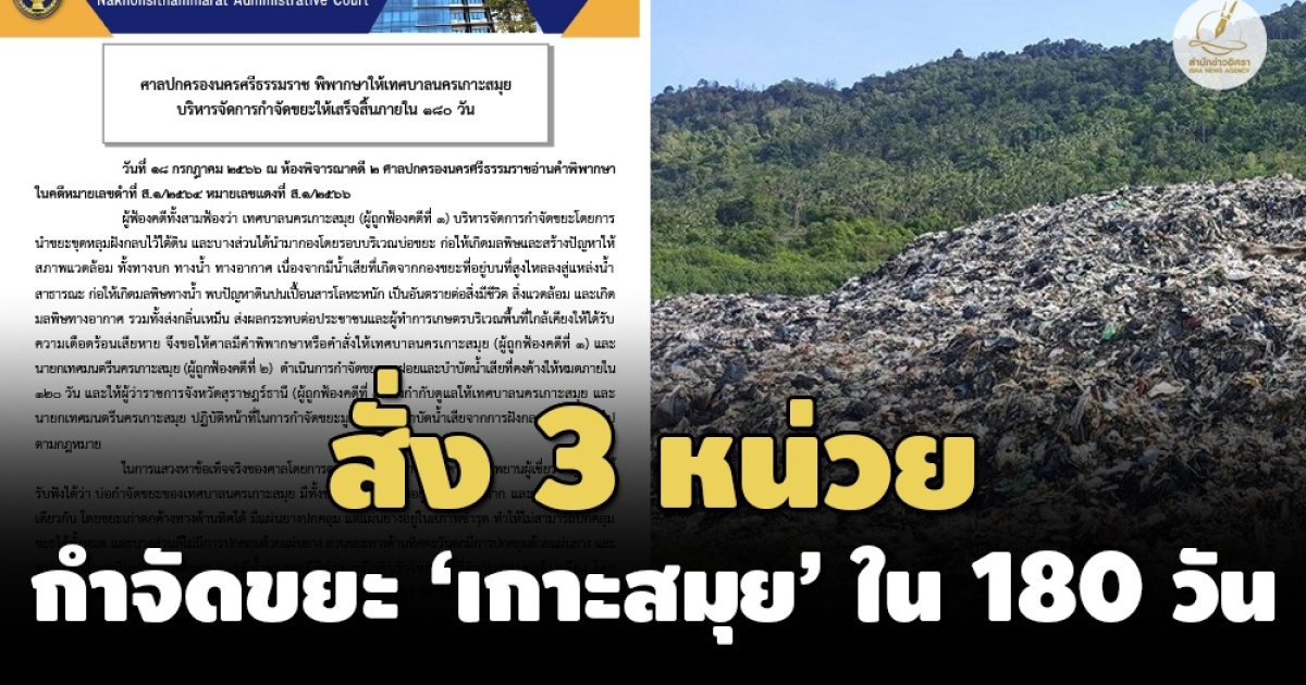 ศาลปกครองนครศรีธรรมราช พิพากษา 3 หน่วยงาน ‘เทศบาลเกาะสมุย - นายกฯเกาะสมุย-ผู้ว่าฯสุราษฎร์ฯ’ ร่วมกันกำจัดขยะ บำบัดน้ำเสีย และขจัดกลิ่นจากกองขยะภายใน 180 วันนับจากวันที่คดีสิ้นสุดลง พร้อมให้รายงานต่อศาลทุกๆ 30 วัน