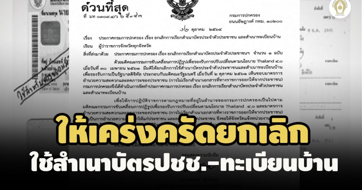 กรมการปกครองจึงได้ดำเนินการจัดทำประกาศกรมการปกครอง เรื่อง ยกเลิกการเรียกสำเนาบัตรประจำตัวประชาชนและสำเนาทะเบียนบ้านเพื่อให้การปฏิบัติราชการตามกฎหมายที่อยู่ในอำนาจของกรมการปกครองเป็นไปตามมติคณะกรรมการขับเคลื่อนการปฏิรูปเพื่อรองรับการปรับเปลี่ยนตามนโยบาย Thailand 4.0 และมาตรการอำนวยความสะดวกและลดภาระของประชาชน (การไม่เรียกสำเนาเอกสารที่ทางราชการออกให้จากประชาชน) อันเป็นการอำนวยความสะดวกให้แก่ประชาชน และลดภาระของประชาชน จึงขอให้จังหวัดแจ้งหน่วยงานบริการประชาชนในสังกัดกรมการปกครอง ปฏิบัติตามประกาศกรมการปกครอง เรื่อง ยกเลิกการเรียกสำเนาบัตรประจำตัวประชาชน และสำเนาทะเบียนบ้าน อย่างเคร่งครัด พร้อมทั้งประชาสัมพันธ์ให้ประชาชนทราบเป็นการทั่วไป (ดูหนังสือประกอบ)