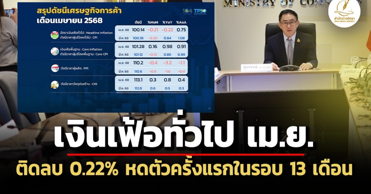 เมื่อวันที่ 6 พ.ค. นายพูนพงษ์ นัยนาภากรณ์ ผู้อำนวยการสำนักงานนโยบายและยุทธศาสตร์การค้า (สนค.) กระทรวงพาณิชย์ แถลงดัชนีเศรษฐกิจการค้า เดือน เม.ย.2568 ว่า ดัชนีราคาผู้บริโภคทั่วไป หรืออัตราเงินเฟ้อทั่วไป (CPI) ในเดือน เม.ย.2568 เท่ากับ 100.14 ลดลง 0.22% เมื่อเทียบกับช่วงเดียวกันของปีก่อน ลดลงครั้งแรกในรอบ 13 เดือน โดยปัจจัยหลักมาจากการลดลงของราคาสินค้าในกลุ่มพลังงาน ได้แก่ แก๊สโซฮอล์ น้ำมันเบนซิน และค่ากระแสไฟฟ้า ตามสถานการณ์ราคาน้ำมันในตลาดโลก และมาตรการช่วยเหลือลดภาระค่าครองชีพของภาครัฐ