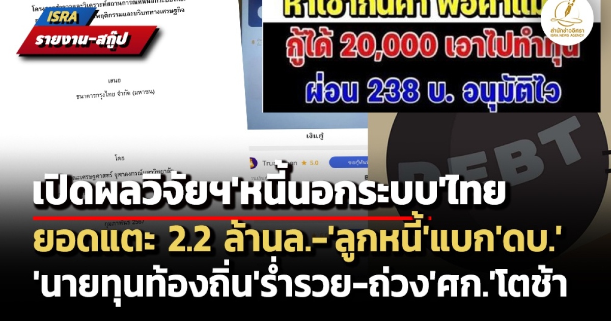 สำนักข่าวอิศรา (www.isranews.org) จึงขอนำเสนอสาระสำคัญรายงานผลการศึกษาฯฉบับดังกล่าว รวมถึงข้อเสนอแนะต่างๆในรายงานฉบับนี้ ที่จะนำไปสู่การแก้ปัญหา ‘หนี้นอกระบบ’ ในประเทศไทยอย่างยั่งยืนและเป็นธรรม โดยมีรายละเอียดที่น่าสนใจ ดังนี้