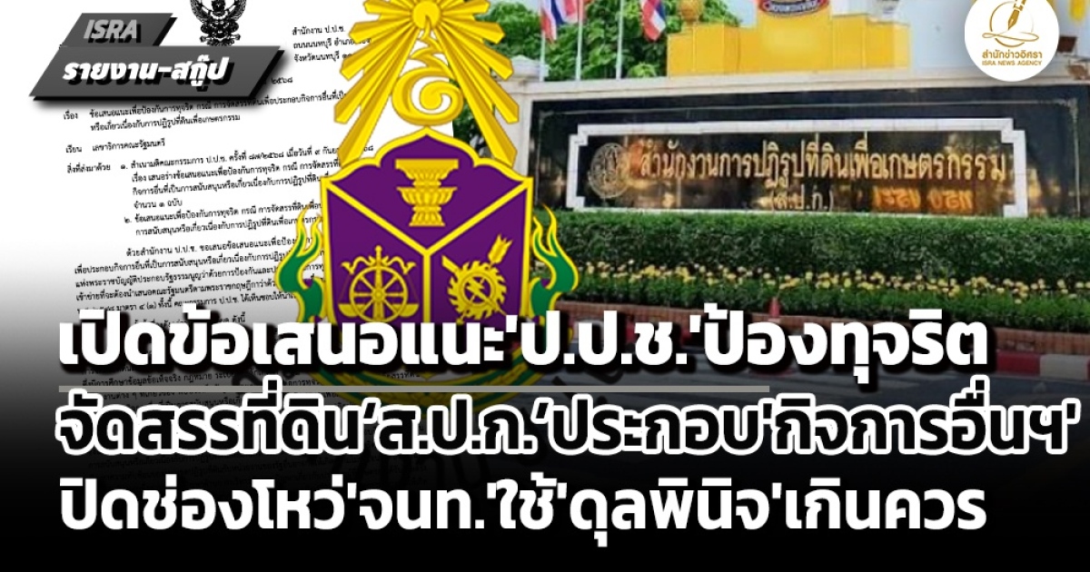 สำนักข่าวอิศรา (www.isranews.org) จึงขอนำเสนอที่มาและรายละเอียดข้อเสนอแนะเพื่อป้องกันการทุจริตกรณีการจัดสรรที่ดินเพื่อประกอบกิจการอื่นที่เป็นการสนับสนุนหรือเกี่ยวเนื่องกับการปฏิรูปที่ดินเพื่อเกษตรกรรม (ส.ป.ก.) ของคณะกรรมการ ป.ป.ช. ดังนี้