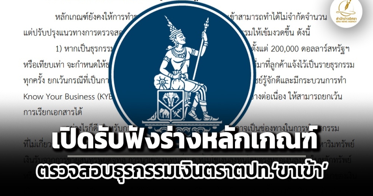 ‘ธปท.’ เปิดรับฟังความคิดเห็นฯ ร่างหลักเกณฑ์ ‘ตรวจสอบธุรกรรมเงินตราต่างประเทศขาเข้า’ กรณีทำธุรกรรมผ่าน ‘แบงก์-นอนแบงก์’ มูลค่าตั้งแต่ 2 แสนดอลลาร์สหรัฐฯขึ้นไป ต้องเรียกตรวจสอบเอกสาร หวังดูแลเสถียรภาพ‘อัตราแลกเปลี่ยน’-สกัดเงินที่ไม่พึงประสงค์เข้าประเทศ