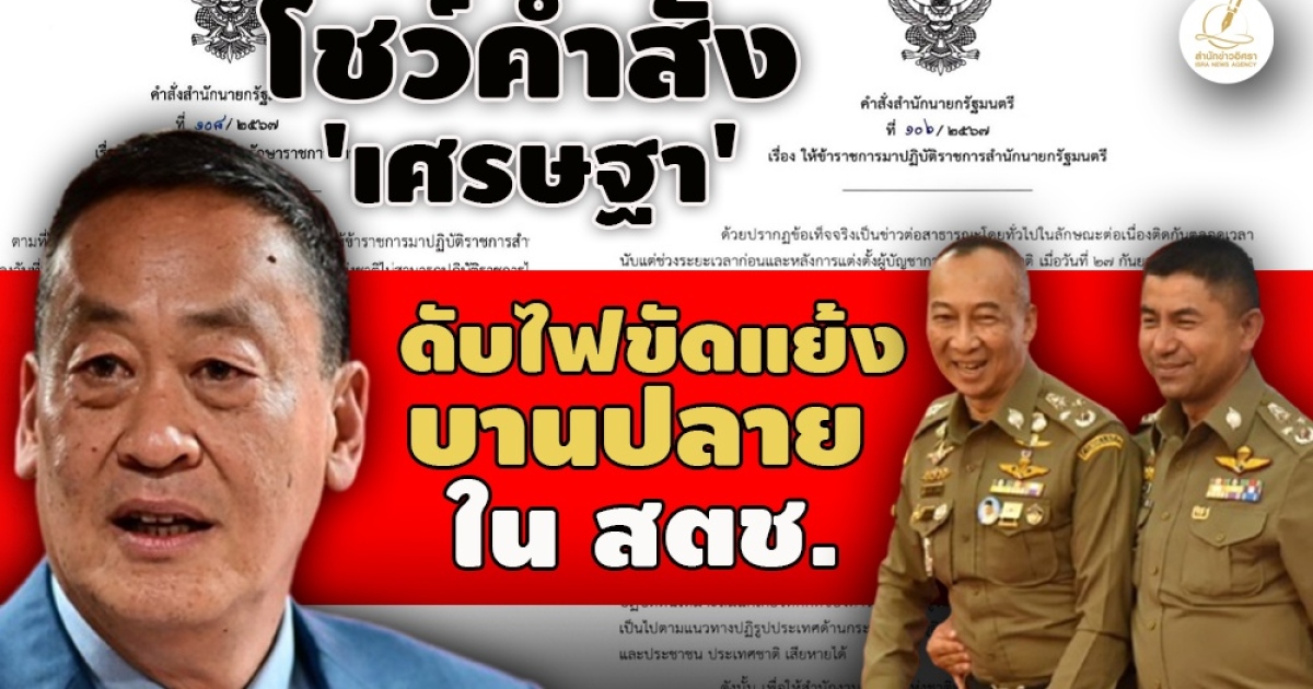 หมายเหตุ สำนักข่าวอิศรา (www.isranews.org) : เมื่อวันที่ 20 มี.ค. 2567 นายเศรษฐา ทวีสิน นายกรัฐมนตรี ได้ลงนามในคำสั่ง 2 ฉบับ เพื่อแก้ไขปัญหาความขัดแย้งในการปฏิบัติราชการของสำนักงานตำรวจแห่งชาติ ฉบับแรกเป็นคำสั่งให้ พล.ต.อ.ต่อศักดิ์ สุขวิมล ผู้บัญชาการสำนักงานตำรวจแห่งชาติ (ผบ.ตร.) และพล.ต.อ.สุรเชษฐ์ หักพาล รองผบ.ตร. เข้ามาช่วยราชการที่สำนักนายกรัฐมนตรี ฉบับที่ 2 มอบหมายให้ พล.ต.อ.กิตติ์รัฐ พันธุ์เพชร รองผบ. ตร.ทำหน้าที่รักษาการ ผบ.ตร. นอกจากนี้ นายเศรษฐา ยังได้ตั้งคณะกรรมการตรวจสอบข้อเท็จจริง มีนายฉัตรชัย พรหมเลิศ อดีตปลัดกระทรวงมหาดไทย เป็นประธาน ให้ได้ข้อสรุปภายใน 2-3 เดือน เพื่อพิจารณาว่าจะย้ายนายตำรวจทั้งสองกลับมาทำงานตามปกติ หรือจะให้ช่วยราชการสำนักนายกฯต่อไป