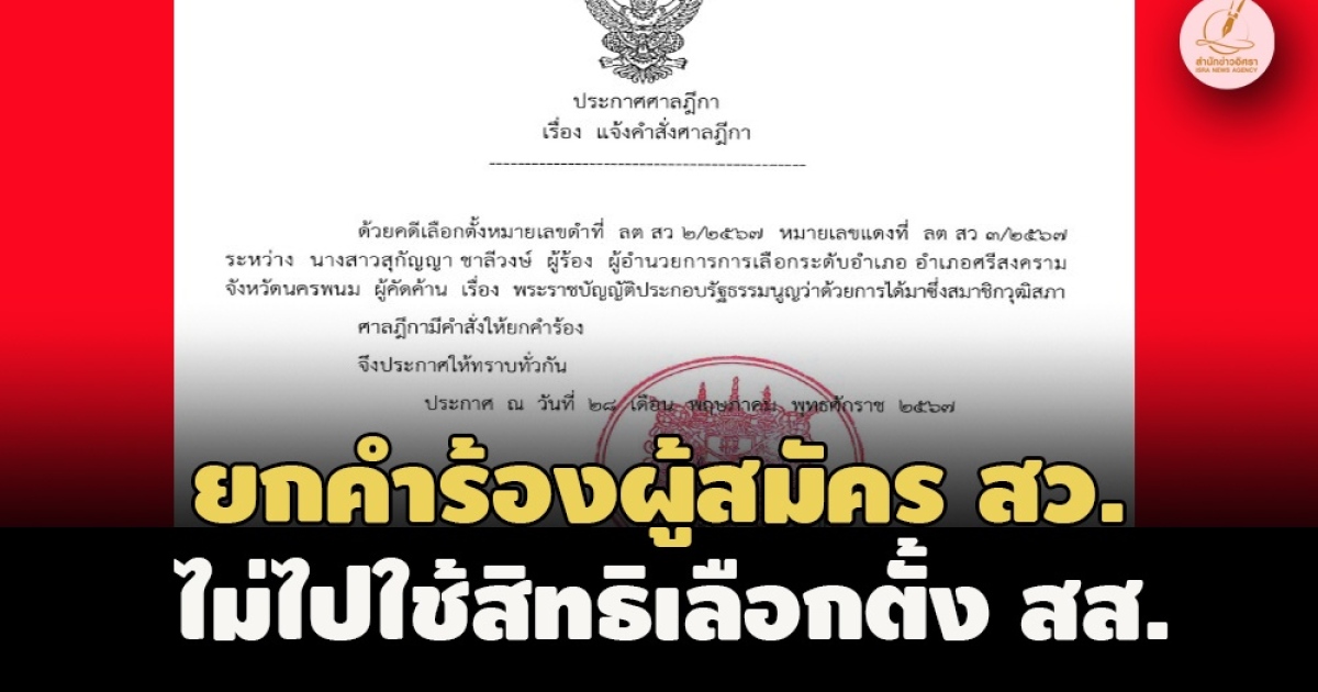 สำนักข่าวอิศรา (www.isranews.org) รายงานว่า เมื่อวันที่ 28 พ.ค.2567 ศาลฎีกามีคำพิพากษาคดีเลือกตั้งหมายเลขดำที่ ลต สว 2/2567 หมายเลขแดงที่ ลต สว 3/2567 ระหว่าง น.ส.สุกัญญา ชาลีวงษ์ ผู้ร้อง ผู้อำนวยการเลือกตั้งระดับอำเภอ อำเภอศรีสงคราม จังหวัดนครพนม ผู้คัดค้าน เรื่องพระราชบัญญัติ ประกอบรัฐธรรมนูญว่าด้วยการได้มาซึ่งสมาชิกวุฒิสภา ศาลฎีกามีคำสั่งยกคำร้อง