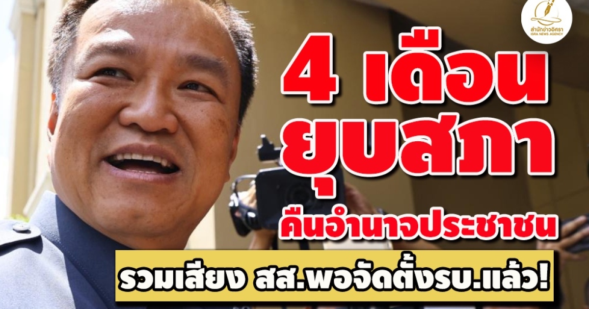 'อนุทิน ชาญวีรกูล' หน.พรรคภูมิใจไทย เผย 'อิศรา' รวมเสียงสส.มากพอ จัดตั้งรัฐบาลแล้ว หลังกล้าธรรมตัดสินใจเข้าร่วมเป็นทางการ เตรียมหารือ ปชช.ย้ำเงื่อนไขอีกรอบ ต้องทำเร็วไม่ให้พรรคต่างๆเปลี่ยนใจกลับไปสนับสนุนเพื่อไทย ลั่นภายใน 4 เดือน จะมีการยุบสภาคืนอำนาจประชาชน