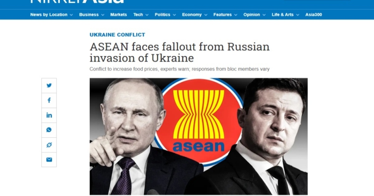 จากปัญหาสงครามระหว่างประเทศยูเครนและประเทศรัสเซียที่กำลัง คุกรุ่นอยู่ ณ เวลานี้นั้น คนไทยส่วนมากอาจมองว่าเรื่องนี้เป็นสิ่งที่ไกลตัวจากประเทศไทย แต่อย่างไรก็ตาม มีรายงานจากสำนักข่าวเอเชียนิกเกอิ ของประเทศญี่ปุ่น ว่าแท้จริงแล้วปัญหาเรื่องเหล่านี้นั้นอาจจะเป็นสิ่งที่ใกล้ตัวและส่งผลกระทบต่อภูมิภาคเอเชียตะวันออกเฉียงใต้หรืออาเซียนเป็นอย่างยิ่ง