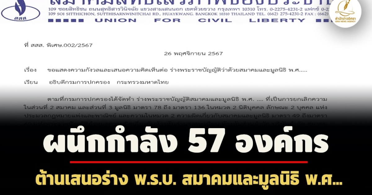 สำนักข่าวอิศรา (www.isranews.org) รายงานว่า เมื่อวันที่ 26 พ.ย. 2567 นายศราวุฒิ ประทุมราช ประธานกรรมการสมาคมสิทธิเสรีภาพของประชาชน (สสส.) ได้ทำหนังสือถึง อธิบดีกรมการปกครอง กระทรวงมหาดไทย เพื่อขอให้ยกเลิกการเสนอร่างกฎหมาย พ.ร.บ. สมาคมและมูลนิธิ พ.ศ. ....เนื่องจากเป็นร่างกฎหมายที่ละเมิดสิทธิเสรีภาพในการรวมกลุ่มและการมีส่วนร่วมของประชาชนในสังคมประชาธิปไตย ขณะที่จัดทำร่างฉบับนี้ขึ้นใหม่มาแทนที่ เป็นกระบวนการจัดทำกฎหมายที่ไม่สอดคล้องกับรัฐธรรมนูญแห่งราชอาณาจักรไทย พ.ศ. 2560 มาตรา 77 และยังเป็นการออกกฎหมายเกินความจำเป็น และเป็นการเพิ่มภาระการดำเนินการของสมาคมหรือมูลนิธิเกินสมควร ขณะที่การกำหนดมาตรการลงโทษทางอาญาโดยไม่มีเหตุผลอันสมควรด้วย
