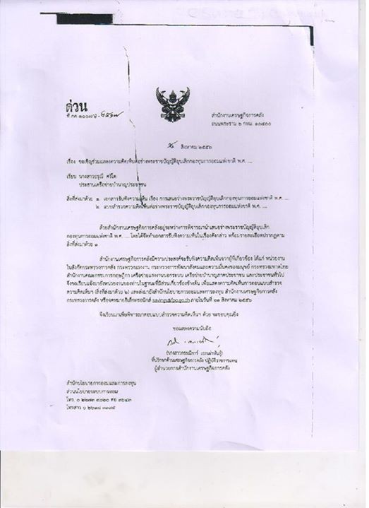 พร้อมกับเอกสารที่ส่งมาด้วย 2 ฉบับ ได้แก่ 1.เอกสารรับฟังความคิดเห็น เรื่องการเสนอร่างพ.ร.บ.ยุบเลิกกองทุนการออมแห่งชาติ พ.ศ.... และ 2.แบบสำรวจความคิดเห็นต่อร่างพ.ร.บ.ยุบเลิกกองทุนการออมแห่งชาติ พ.ศ.... นั้น