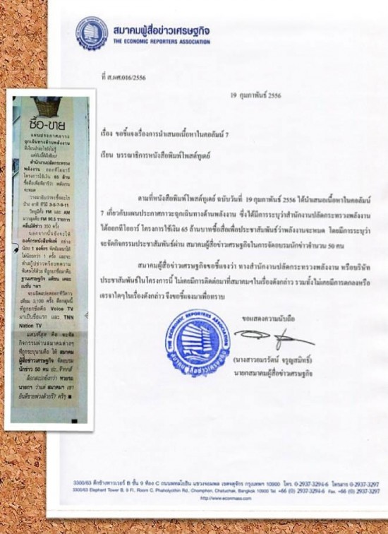 “สมาคมผู้สื่อข่าวเศรษฐกิจ ขอชี้แจงว่า ทางสำนักงานปลัดกระทรวงพลังงาน หรือบริษัทประชาสัมพันธ์โครงการนี้ ไม่เคยติดต่อมาที่สมาคมฯ ในเรื่องดังกล่าว รวมทั้งไม่เคย มีการตกลงหรือ เจรจาใดๆ ในเรื่องดังกล่าว จึงขอชี้แจงมาเพื่อทราบ”