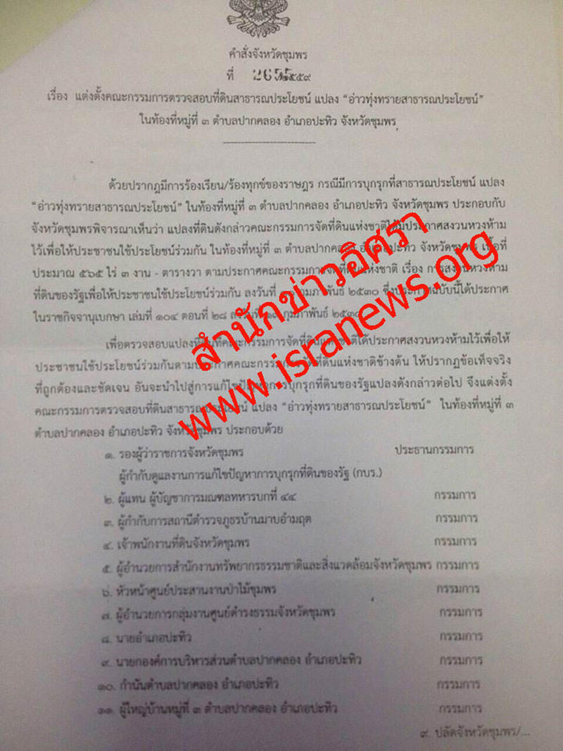 ล่าสุดสำนักข่าวอิศรา www.isranews.org รายงานว่า คำสั่งที่นายสมดี คชายั่งยืน ผู้ว่าราชการจังหวัดชุมพร ลงนามในคำสั่งแต่งตั้งคณะกรรมการตรวจสอบข้อเท็จจริง มีรองผู้ว่าฯ ผู้ดูแลงานการแก้ไขปัญหาบุกรุกที่ดินของรัฐ (กบร.) เป็นประธานกรรมการ กรรมการ อาทิ ผู้แทนผู้บัญชาการมณฑลทหารบกที่ 44 ผู้กำกับการสถานีตำรวจภูธรบ้านมาบอำมฤต เจ้าพนักงานที่ดินจังหวัด ผู้อำนวยการสำนักงานทรัพยากรธรรมชาติและสิ่งแวดล้อมจังหวัดชุมพร หัวหน้าศูนย์ประสานงานป่าไม้ชุมพร ผู้อำนวยการกลุ่มงานศูนย์ดำรงธรรมจังหวัดชุมพร นายอำเภอปะทิว นายกองค์การบริหารส่วนตำบล (อบต.) ปากคลอง อ.ปะทิว กำนันตำบลปากคลอง ผู้ใหญ่บ้านหมู่ที่ 3 ต.ปากคลอง เป็นต้น