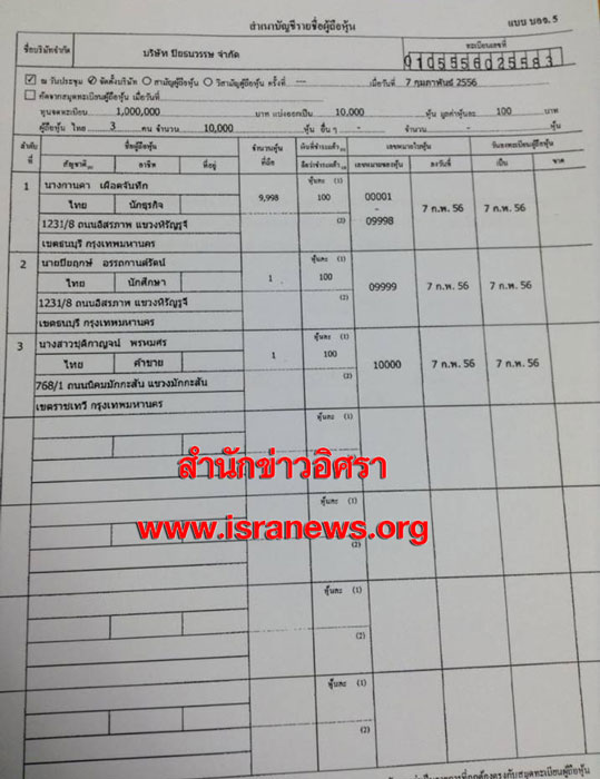 1.นางกานดา 9,998 หุ้น (หุ้นละ 100 บาท) มูลค่า 999,800 บาท