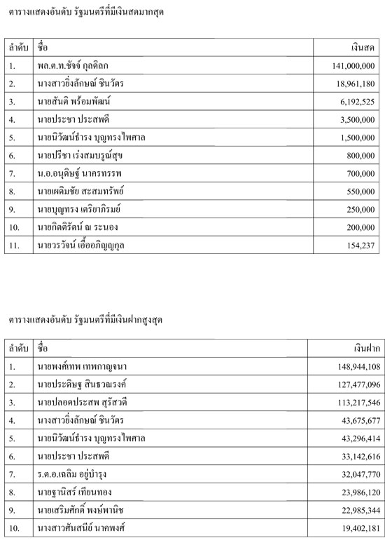 นางสาวยิ่งลักษณ์ ชินวัตร จำนวน 43,675,677 บาท ระบุว่าเป็นของตน38,156,53160 บาท ของคู่สมรส 5,458,969 บาท และของบุตรที่ยังไม่บรรลุนิติภาวะ 60,547 บาท