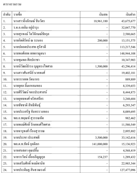 ในส่วนของเงินฝาก ผู้ที่แจ้งถือครองมากสุด 3 อันดับแรก ได้แก่