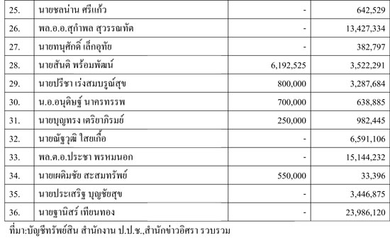 นายประชา ประสพดี จำนวน 33,142,616 บาท ระบุว่าเป็นของตน 5,989,750 บาท และของคู่สมรส 27,152,866 บาท