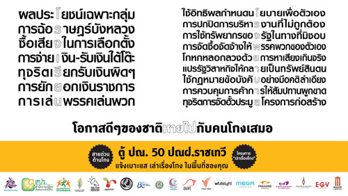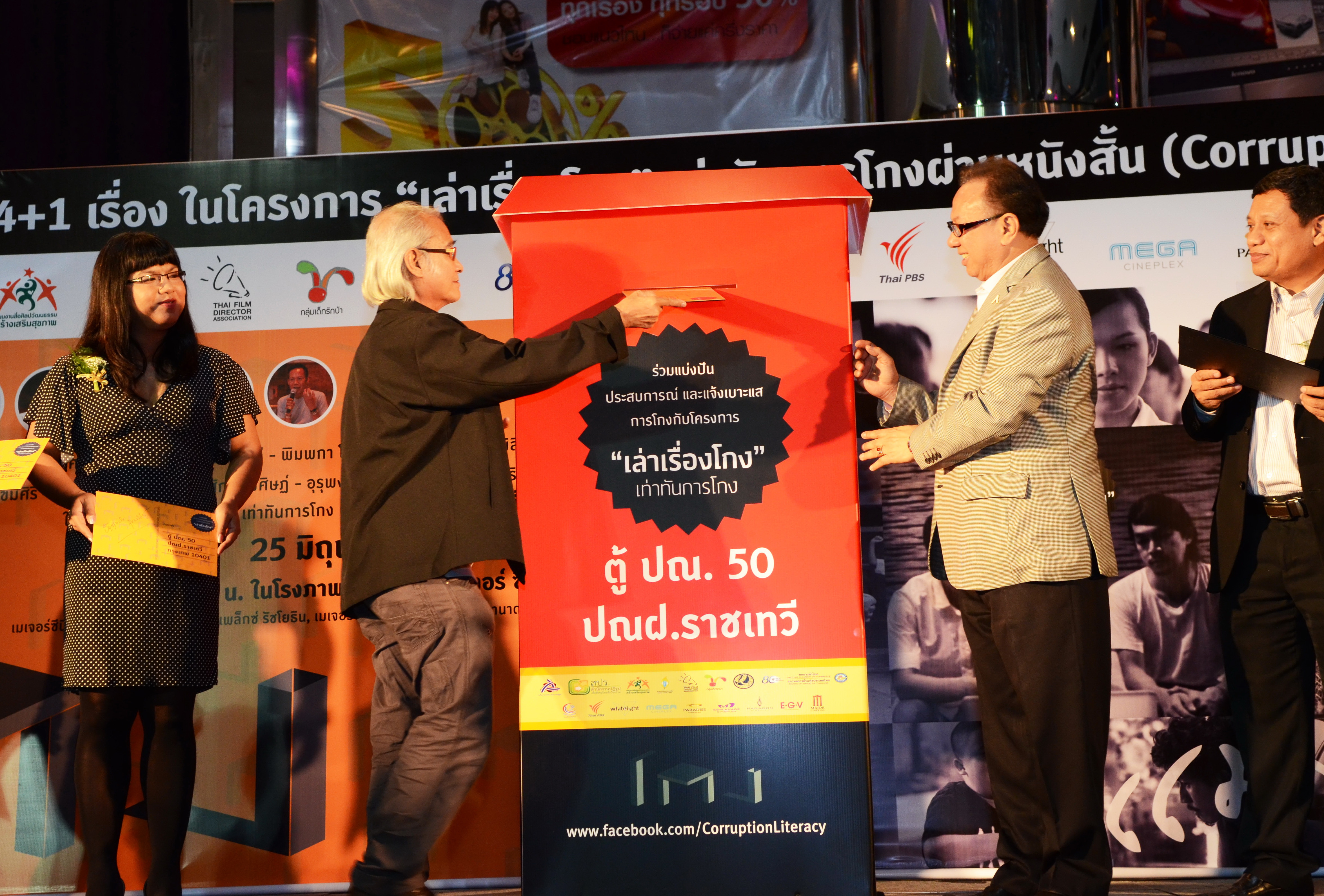 นายเนาวรัตน์ พงษ์ไพบูลย์ ประธานคณะกรรมการเครือข่ายศิลปินเพื่อการปฏิรูป ชวนคนไทยแจ้งเบาะแสการโกง ผ่านตู้ ปณ. 50 ปณฝ.ราชเทวี กรุงเทพมหานคร สายด่วนต้านโกง ก่อนรวบรวมจัดทำเป็นฐานข้อมูล เพื่อส่งต่อให้กับหน่วยงานที่เกี่ยวข้องทั้งสำนักงานคณะกรรมการป้องกันและปราบปรามการทุจริตแห่งชาติ (ป.ป.ช.), สำนักงานคณะกรรมการป้องกันและปราบปรามการทุจริตในภาครัฐ กระทรวงยุติธรรม (ป.ป.ท.), สำนักนายกรัฐมนตรี ในการป้องกันปราบปราม