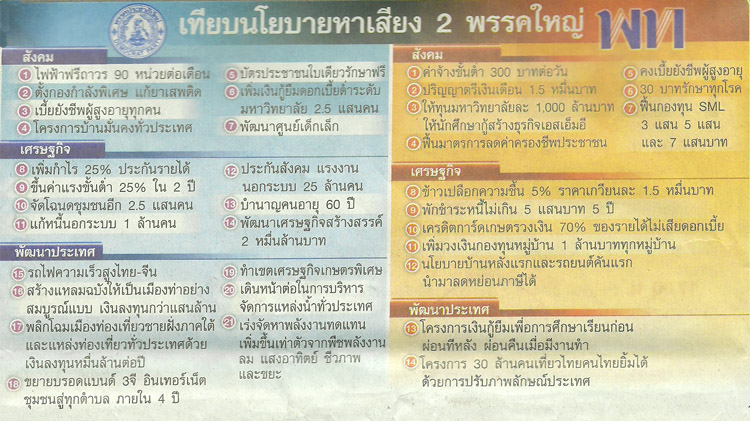 นายพรศิลป์ พัชรินทร์ตนะกุล รองกรรมการหอการค้าไทย กล่าวว่า นโยบายของ 2 พรรคการเมือง ได้แก่ พรรคประชาธิปัตย์และพรรคเพื่อไทย ที่ประกาศใช้สู้ศึกการเลือกตั้งครั้งนี้ ในมุมมองของภาคเอกชน นโยบายส่วนใหญ่คล้ายกันคือต้องการให้คนมีรายได้เพิ่มขึ้น เป็นนโยบายประชานิยมเฉพาะหน้าไว้ขายเวลาเลือกตั้ง แต่ขาดนโยบายที่เป็นยุทธศาสตร์ประเทศหรือการวางแผนของการเจริญเติบโตของประเทศในระยะยาว เนื่องจากเรื่องต่างๆ มีเป้าหมายที่เล็กเกินไปเป็นนโยบายของรัฐบาลไม่ได้
