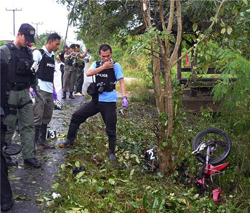 ใต้ยังระอุต่อเนื่อง คนร้ายลอบจุดระเบิดมอเตอร์ไซค์บอมบ์ในเขตเมืองยะลา ตูมสนั่นขณะรถกระบะของทหารแล่นผ่าน ผลทหารบาดเจ็บ 4 นาย สาหัส 2 เด็กเล็กวิ่งเล่นเจอลูกหลงเจ็บอีก 2 ตำรวจปัตตานีโชว์ผลงานตามรวบผู้ต้องหาคนสำคัญ มีหมายจับเพียบทั้งคดียิงผู้พิพากษา บึ้มโรงแรมซี.เอส. ฆ่าเผาสองพี่น้อง