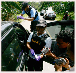บรรยายภาพ : เจ้าหน้าที่กองพิสูจน์หลักฐานกำลังตรวจรถยนต์ของนายก อบต.กระโด หลังถูกยิงถล่ม