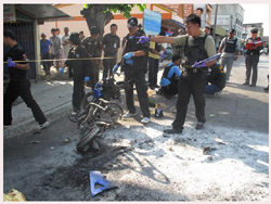 บรรยายภาพ : เจ้าหน้าที่จากกองพิสูจน์หลักฐานกำลังตรวจจุดเกิดเหตุมอเตอร์ไซค์บอมบ์หน้าร้านน้ำชาในเขตเทศบาลเมืองปัตตานี
