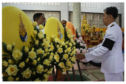 บรรยายภาพ : นายกฤษฎา บุญราช ผู้ว่าราชการจังหวัดยะลา ได้อัญเชิญพวงมาลาพระราชทานจาก พระบาทสมเด็จพระเจ้าอยู่หัว สมเด็จพระนางเจ้าฯ พระบรมราชินีนาถ และพระบรมวงศานุวงศ์ทุกพระองค์ รวม 11 พระองค์ ไปวางหน้าหีบศพ ด.ต.โสภณ อินทรบวร ตำรวจ สภ.บันนังสตา พลขับของ พ.ต.อ.สมเพียร เอกสมญา ผกก.สภ.บันนังสตา ที่วัดพุทธภูมิ พระอารามหลวง อ.เมือง จ.ยะลา