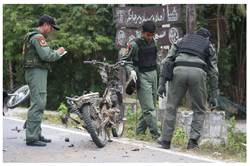 บรรยายภาพ : เจ้าหน้าที่กำลังตรวจสอบซาก "มอเตอร์ไซค์บอมบ์" ที่ อ.รามัน จ.ยะลา โชคดีที่ระเบิดพลาดเป้า ไม่มีผู้ใดได้รับบาดเจ็บ
