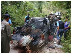 บรรยายภาพ : เจ้าหน้าที่กำลังตรวจสอบจุดเกิดเหตุคนร้ายยิงถล่มพรานหาของป่าเสียชีวิต 6 ศพ บริเวณเชิงเขาบูโด อ.บาเจาะ จ.นราธิวาส