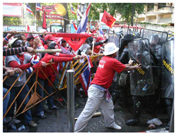 บรรยายภาพ : ทหารเข้าผลักดันกลุ่มคนเสื้อแดงเพื่อขอพื้นที่คืนใกล้กับสะพานผ่านฟ้าลีลาศในช่วงบ่าย ก่อนที่ตกค่ำจะเกิดจลาจลขึ้นในเขตกรุงเทพฯชั้นใน