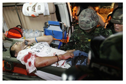 1 ทหารลำเลียงคนเจ็บจากเหตุคนร้ายยิงระเบิดเอ็ม 79 ถล่มย่านสีลม ส่งโรงพยาบาล บรรยากาศเป็นไปอย่างอลหม่านและทุลักทุเล (ขอบคุณภาพประกอบจากเว็บไซต์ผู้จัดการ www.manager.co.th)