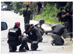 บรรยายภาพ : เจ้าหน้าที่กำลังตรวจสอบจุดเกิดเหตุระเบิด บริเวณด้านหลังธนาคารออมสิน สาขาบันนังสตา ในเขตเทศบาลตำบลบันนังสตา จ.ยะลา ซึ่งทำให้เจ้าหน้าที่ตำรวจได้รับบาดเจ็บสาหัส 3 นาย หนึ่งในนั้นเป็นระดับรองสารวัตร