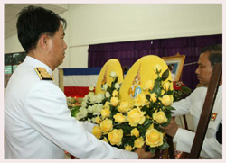 บรรยายภาพ : นายกฤษฎา บุญราช ผู้ว่าราชการจังหวัดยะลา เป็นผู้แทนอัญเชิญพวงมาลาหลวง และพวงมาลาพระราชทานจาก พระบาทสมเด็จพระเจ้าอยู่หัว สมเด็จพระนางเจ้าฯ พระบรมราชินีนาถ และพระบรมวงศานุวงศ์ทุกพระองค์ วางหน้าหีบศพครูภาศ ลาภเจือจันทร์