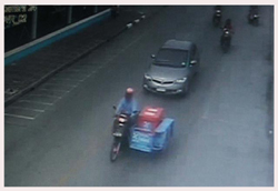1 ภาพจากกล้องโทรทัศน์วงจรปิด พบชายต้องสงสัยเป็นมือระเบิดปลอมตัวเป็นพนักงานส่งนม ขี่รถจักรยานยนต์พ่วงข้างซึ่งคาดว่าซุกระเบิดไว้ภายในไปจอดตรงจุดเกิดเหตุ ก่อนใช้วิทยุสื่อสารกดจุดชนวน