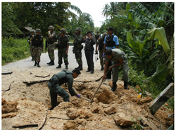 บรรยายภาพ : เจ้าหน้าที่กำลังตรวจสอบหลุมระเบิดขนาดใหญ่ที่คนร้ายจุดชนวนระเบิดแสวงเครื่องดักสังหารทหารที่ อ.บาเจาะ จ.นราธิวาส