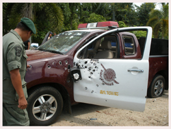 บรรยายภาพ : สภาพรถสายตรวจ สภ.ระแงะ ที่ถูกคนร้ายลอบวางระเบิดหน้าปั๊มน้ำมันย่านตันหยงมัส