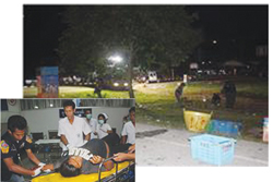 บรรยายภาพ : เจ้าหน้าที่ตรวจจุดเกิดเหตุระเบิดบริเวณตลาดผลไม้แยกมลายูบางกอก อ.เมืองยะลา ขณะที่ นางเสาวลักษณ์ จั่นเจริญ หญิงท้องแก่เหยื่อบึ้ม ถูกเข็นเข้าห้องผ่าตัดเป็นการด่วน (ภาพโดย อะหมัด รามันห์สิริวงศ์)