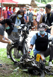 บรรยายภาพ : เจ้าหน้าที่ชุดพิสูจน์หลักฐานกำลังตรวจรถจักรยานยนต์ที่คนร้ายซุกระเบิดเอาไว้ และจุดชนวนระเบิดจนรถพังยับเยิน มีประชาชนได้รับบาดเจ็บ 4 ราย เหตุเกิดใกล้กับตลาดนัดในหมู่บ้านทรายขาว อ.โคกโพธิ์ จ.ปัตตานี ซึ่งจัดเป็นพื้นที่สันติสุข