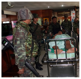 บรรยายภาพ : เพื่อนทหารช่วยกันลำเลียงผู้ได้รับบาดเจ็บจากเหตุการณ์คนร้ายลอบวางระเบิดชุดลาดตระเวนในท้องที่ อ.ยะรัง จ.ปัตตานี ส่งโรงพยาบาลยะรัง เหตุเกิดเมื่อวันพฤหัสบดีที่ 23 ก.ย.2553 (ภาพโดย อับดุลเลาะ หวังนิ)