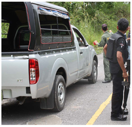 บรรยายภาพ : เจ้าหน้าที่ตรวจจุดเกิดเหตุคนร้ายดักระเบิดรถรับส่งนักเรียนในท้องที่ สภ.กรงปินัง จ.ยะลา (ภาพโดย อะหมัด รามันห์สิริวงศ์)
