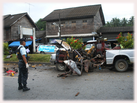 ผลการตรวจสถานที่เกิดเหตุอย่างละเอียดพบว่า สีของรถกระบะที่คนร้ายใช้ก่อเหตุ แยกได้ถึง 3 สี คือบริเวณห้องเครื่องยนต์เป็นสีแดง ตัวถังของรถที่มองเห็นจากภายนอกเป็นสีขาว-เทา แต่เมื่อใช้ของแข็งขูดสีชั้นนอกออก จะพบสีน้ำเงินถูกพ่นทับไว้อีกชั้นหนึ่ง จึงไม่แน่ชัดว่าสีเดิมของรถคันนี้เป็นสีอะไรกันแน่ ส่วนระเบิดที่คนร้ายใช้ จุดชนวนด้วยโทรศัพท์มือถือ