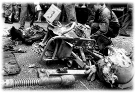 บรรยายภาพ : ซาก "บอมบ์สูท" และหุ่นยนต์กู้ระเบิดที่ถูกแรงระเบิดอัดทำลายในเหตุการณ์ร้ายที่ ต.ปะลุรู อ.สุไหงปาดี จ.นราธิวาส เมื่อวันที่ 1 ม.ค.2554