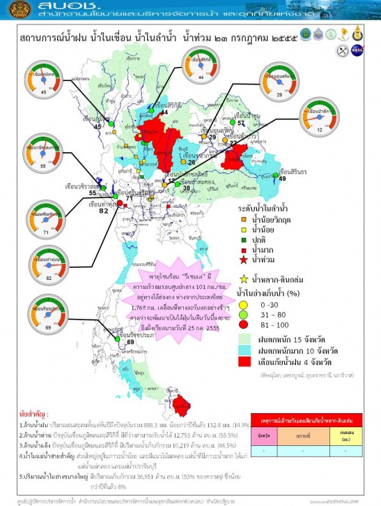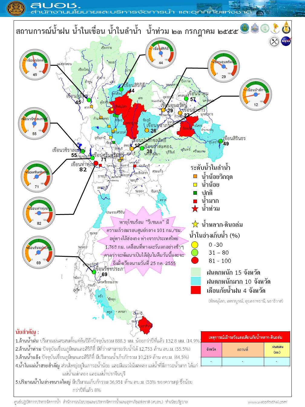 ศูนย์ประมวลวิเคราะห์สถานการณ์น้ำกรมชลประทาน รายงานสถานการณ์น้ำในอ่างเก็บน้ำขนาดใหญ่ทั้งประเทศ ล่าสุด (23 ก.ค. 55) มีปริมาณน้ำรวมกัน จำนวน 36,945 ล้านลูกบาศก์เมตร หรือคิดเป็นร้อยละ 53 ของความจุอ่างฯขนาดใหญ่รวมกันทั้งหมด สามารถรองรับน้ำในช่วงฤดูฝนนี้ได้อีกกว่า 33,000 ล้านลูกบาศก์เมตร