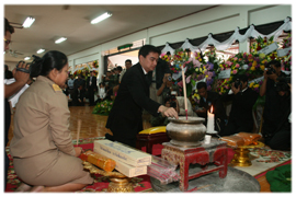 บรรยายภาพ : นายอภิสิทธิ์ เวชชาชีวะ นายกรัฐมนตรีจุดธูปเคารพศพ ครูมาโนช ชฎารัตน์ ที่ถูกยิงเสียชีวิตก่อนวันครูเพียง 1 วัน ศพตั้งบำเพ็ญกุศลที่วัดนพวงศาราม อ.เมืองปัตตานี (ภาพโดย อับดุลเลาะ หวังนิ)