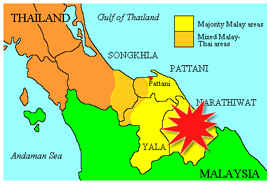 บรรยายภาพ : แผนที่สามจังหวัดชายแดนภาคใต้ แสดงจุดโจมตีฐานทหารใน อ.ระแงะ จ.นราธิวาส