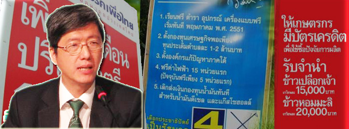 ทั้งนี้ ดร.สมชัย กล่าวด้วยว่า ขณะนี้ประเทศไทยเริ่มมีนโยบายประชานิยมแบบพร่ำเพรื่อ เช่น นโยบายพักหนี้ดี โดยมองว่า ไม่มีความจำเป็นสำหรับผู้ที่มีหนี้ดีแล้ว แต่ด้วยความที่ต้องการชนะการเลือกตั้งจึงเกิดนโยบายในลักษณะนี้ขึ้น รวมไปถึง นโยบายจำนำข้าวด้วย โดยมองว่าเป็นการทำลายระบบตลาดข้าวอย่างสิ้นเชิง หลังจากที่มีการเปลี่ยนขั้วรัฐบาลและดู เหมือนจะดีขึ้น แต่ก็ต้องถูกทำลายอีกครั้ง เนื่องจากองคาพยพที่ช่วยผลักดันให้ข้าวไทยได้เชิดหน้าชูตามาหลายปีนั้นต้อง ถูกทำลายหมด ซึ่งถือว่าเป็นบาปต่อชาวนาในระยะยาว และร้ายแรงกว่าปัญหาหนี้สาธารณะเสียอีก