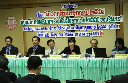 วันที่ 22 มิถุนายน คณะกรรมาธิการวิสามัญศึกษาปัญหาอุทกภัย 2554 วุฒิสภา จัดสัมมนาเรื่อง “ผ่าวิกฤตมหาอุทกภัย 2554 กับนโยบายเตรียมพร้อมรับมืออุทกภัย 2555 ของรัฐบาล” ณ อาคารรัฐสภา 2 โดยมี ดร.รอยล จิตรดอน คณะกรรมการยุทธศาสตร์เพื่อวางระบบบริหารจัดการทรัพยากรน้ำ (กยน.) ดร.สุรชัย สถิตคุณารัตน์ คณะทำงานของดร.ปลอดประสพ สุรัสวดี รัฐมนตรีว่าการกระทรวงวิทยาศาสตร์และเทคโนโลยี พลตำรวจโททวีศักดิ์ ตู้จินดา กรรมาธิการวิสามัญในคณะกรรมาธิการวิสามัญศึกษาปัญหาอุทกภัย 2554 วุฒิสภา ร่วมเสวนา และมีผู้ว่าราชการจังหวัด เจ้าหน้าที่หน่วยงานภาครัฐ เอกชน ประชาชนเข้าร่วมรับฟังประมาณ 200 คน